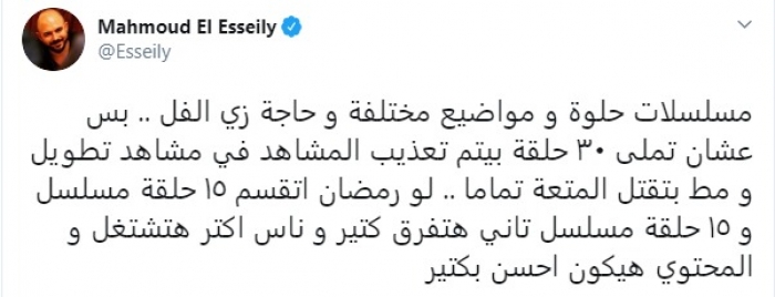 وكتب: "مسلسلات حلوة ومواضيع مختلفة وحاجة زي الفل، بس عشان تملى ٣٠ حلقة بيتم تعذيب المشاهد في مشاهد تطويل ومط بتقتل المتعة تماما".