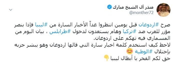 وكتب مبارك عبر تغريدة له على "تويتر" رصدها " المشهد العربي": "صرح أردوغان قبل يومين انتظروا غداً الأخبار السارة من ليبيا، فإذا بنصر مؤزر للعرب ضد تركيا وهام يستعدون لدخول طرابلس ، بيان اليوم من المسماري فيه تهكم على أردوغان".