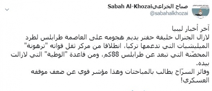 وكتب الخزاعي عبر تغريدة له على "تويتر" رصدها " المشهد العربي": "آخر أخبار ليبيا، لازال الجنرال خليفة حفتر يديم هجومه على العاصمة طرابلس لطرد المليشيات التي تدعمها تركيا، انطلاقا من مركز ثقل قواته "ترهونة" المحصّنة التي تبعد عن طرابلس 88كم، ومن قاعدة "الوطية" التي لازالت بيده".