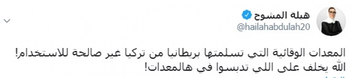 وكتبت المشوح عبر تغريدة لها على "تويتر" رصدها " المشهد العربي": "المعدات الوقائية التي تسلمتها بريطانيا من تركيا غير صالحة للاستخدام، الله يخلف على اللي تدبسوا في المعدات".