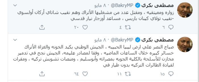 وكتب بكري عبر تغريدات له على "تويتر" رصدها " المشهد العربي": "صباح النصر علي أرض ليبيا الحبيبة، الجيش الوطني يكبد الخونة والغزاة الأتراك خسائر كبيره خلال الساعات الماضية".