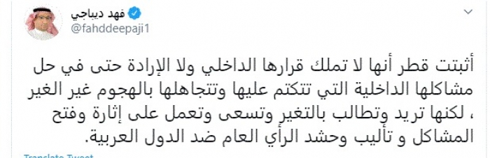 وكتب في تغريدة عبر "تويتر" رصدها "المشهد العربي": "أثبتت قطر أنها لا تملك قرارها الداخلي ولا الإرادة حتى في حل مشاكلها الداخلية التي تتكتم عليها وتتجاهلها بالهجوم غير الغير".