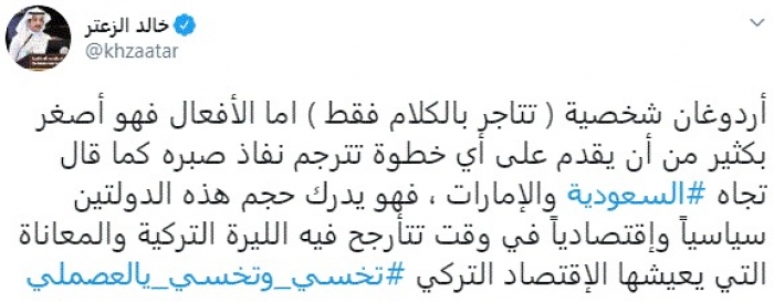 وكتب في تغريدة عبر "تويتر" رصدها "المشهد العربي": "أردوغان شخصية (تتاجر بالكلام فقط) أما الأفعال فهو أصغر بكثير من أن يقدم على أي خطوة تترجم نفاذ صبره كما قال تجاه السعودية والإمارات".