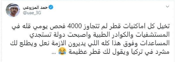 وكتب في تغريدة عبر "تويتر" رصدها "المشهد العربي": "تخيل كل إمكانيات قطر لم تتجاوز 4000 فحص يومي قلة في المستشفيات والكوادر الطبية وأصبحت دولة تستجدي المساعدات وفوق هذا كله اللي يديرون الأزمة ... ويطلع لك مشرد في تركيا ويقول لك قطر عظيمة".