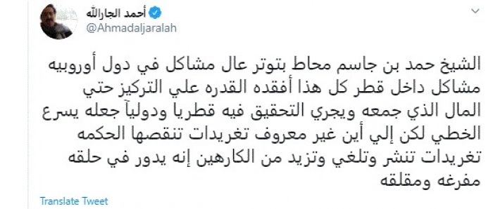 وكتب في تغريدة عبر "تويتر" رصدها "المشهد العربي": "الشيخ حمد بن جاسم محاط بتوتر عال مشاكل في دول أوروبية مشاكل داخل قطر كل هذا أفقده القدرة على التركيز".