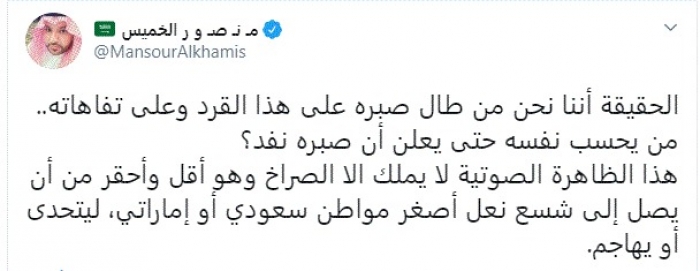 وأضاف: "هذا الظاهرة الصوتية لا يملك إلا الصراخ وهو أقل وأحقر من أن يصل إلى شسع نعل أصغر مواطن سعودي أو إماراتي، ليتحدى أو يهاجم".