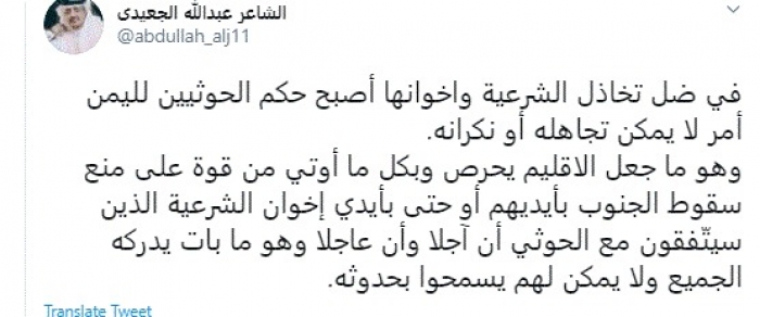 وكتب في تغريدة عبر "تويتر" رصدها "المشهد العربي": "في ظل تخاذل الشرعية وإخوانها أصبح حكم الحوثيين لليمن أمر لا يمكن تجاهله أو نكرانه".