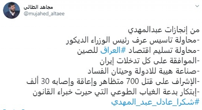 وقال في تغريدة عبر "تويتر" رصدها "المشهد العربي": "من انجازات عبدالمهدي.. محاولة تأسيس عرف رئيس الوزراء الديكور.. محاولة تسليم اقتصاد العراق للصين.. الموافقة على كل تدخلات إيران".