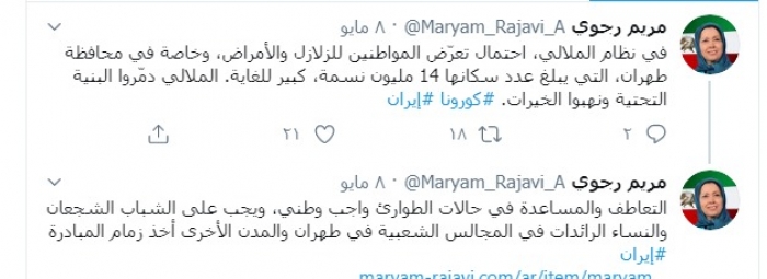 وكتبت رجوي عبر تغريدة لها على " تويتر" رصدها " المشهد العربي": "في نظام الملالي، احتمال تعرّض المواطنين للزلازل والأمراض، وخاصة في محافظة طهران، التي يبلغ عدد سكانها 14 مليون نسمة، كبير للغاية، الملالي دمّروا البنية التحتية ونهبوا الخيرات".