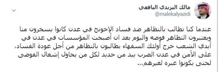 وكتب اليافعي عبر تغريدة له على "تويتر" رصدها " المشهد العربي":" عندما كنا نطالب بالتظاهر ضد فساد الإخونج في عدن كانوا يسخرون منا ويعتبرون التظاهر فوضى، واليوم بعد ان أصبحت المؤسسات في عدن في أيدي الشعب خرج أولئك السفهاء يطالبون بالتظاهر من أجل عودة الفساد".