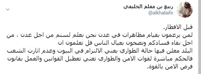 وكتب الخليفي عبر تغريدة له على "تويتر" رصدها " المشهد العربي": "لمن يزعمون بقيام مظاهرات في عدن نحن نعلم لستم من أجل عدن ، من أجل بقاء فسادكم وتضحون بعيال الناس".