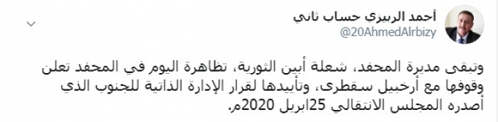 وكتب الربيزي عبر تغريدة له على "تويتر" رصدها " المشهد العربي": "وتبقى مديرة المحفد، شعلة أبين الثورية، تظاهرة اليوم في المحفد تعلن وقوفها مع أرخبيل سقطرى، وتأييدها لقرار الإدارة الذاتية للجنوب الذي أصدره المجلس الانتقالي 25 إبريل 2020م".