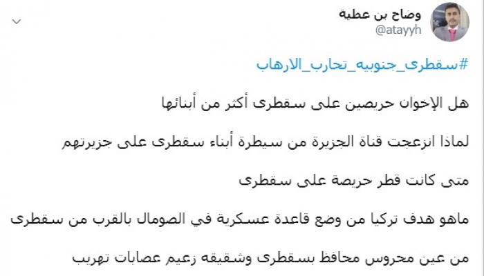 وتساءل بن عطية عبر تغريدة له على "تويتر" رصدها " المشهد العربي":" هل الإخوان حريصين على سقطرى أكثر من أبنائها، لماذا انزعجت قناة الجزيرة من سيطرة أبناء سقطرى على جزيرتهم، متى كانت قطر حريصة على سقطرى".