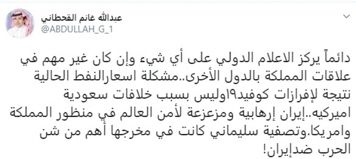 القحطاني: إيران دولة إرهابية.. وتصفية سليماني أهم من الحرب عليها