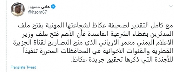 طالب المحلل السياسي هاني مسهور، اليوم، صحيفة عكاظ السعودية بفتح ملف وزير الإعلام اليمني معمر الإرياني، وذلك بعد منحه تصاريح لقناة الجزيرة القطرية والقنوات الإخوانية للعمل في المحافظات المحررة تنفيذاً للأجندة القطرية والتركية.