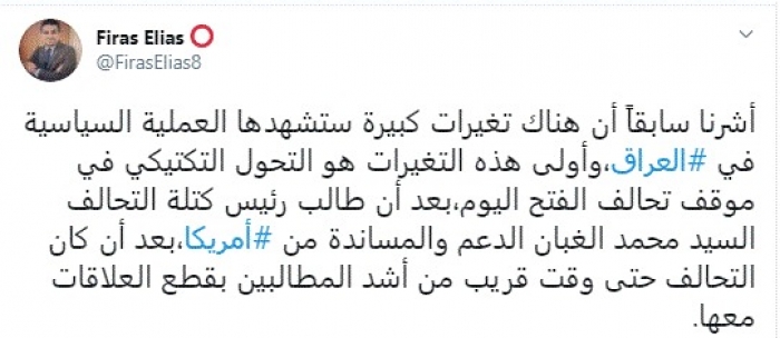 وقال في تغريدة عبر "تويتر" رصدها "المشهد العربي": "أشرنا سابقاً أن هناك تغيرات كبيرة ستشهدها العملية السياسية في العراق،وأولى هذه التغيرات هو التحول التكتيكي في موقف تحالف الفتح اليوم".