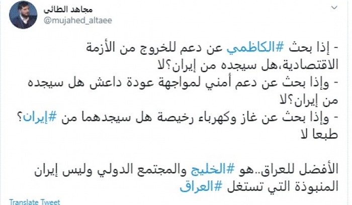وقال في تغريدة عبر "تويتر" رصدها "المشهد العربي": "إذا بحث الكاظمي عن دعم للخروج من الأزمة الاقتصادية، هل سيجده من إيران؟ لا.. وإذا بحث عن دعم أمني لمواجهة عودة داعش هل سيجده من إيران؟ لا".