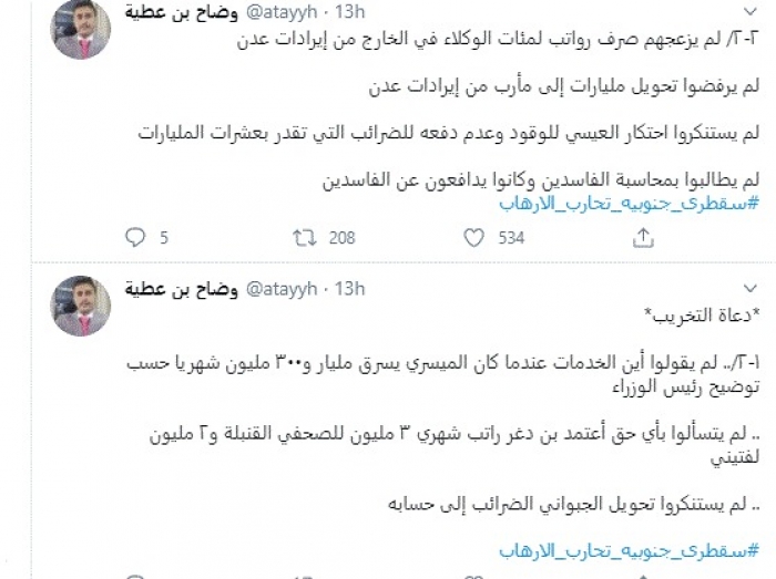 وقال في تغريدات عبر "تويتر" رصدها "المشهد العربي": "دعاة التخريب لم يقولوا أين الخدمات عندما كان الميسري يسرق مليار و300 مليون شهريًا حسب توضيح رئيس الوزراء، لم يتسألوا بأي حق أعتمد بن دغر راتب شهري 3 مليون للصحفي القنبلة و2 مليون لفتيني، لم يستنكروا تحويل الجبواني الضرائب إلى حسابه".