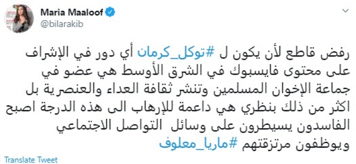 كشفت الإعلامية اللبنانية ماريا معلوف، أسباب الرفض القاطع لوجود القيادية الإخوانية توكل كرمان في مراقبة محتوى "فيس بوك"، مؤكدةً أنها تنشر ثقافة العداء والعنصرية كما أنها تدعم الإرهاب.