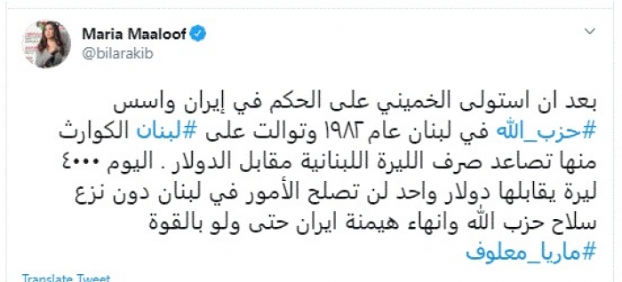 وقالت في تغريدة عبر "تويتر" رصدها "المشهد العربي": "بعد أن استولى الخميني على الحكم في إيران وأسس حزب الله في لبنان عام ١٩٨٢ وتوالت على لبنان الكوارث منها تصاعد صرف الليرة اللبنانية مقابل الدولار".