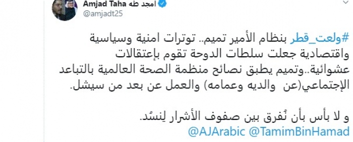 وأضاف: "وتميم يطبق نصائح منظمة الصحة العالمية بالتباعد الاجتماعي (عن والديه وعمامه) والعمل عن بعد من سيشل. ولا بأس بأن نُفرق بين صفوف الأشرار لِنسُد".