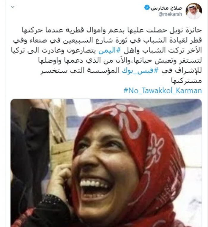 وكتب "مخارش" في تغريدة عبر حسابه بتويتر، رصدها "المشهد العربي": "جائزة نوبل حصلت عليها بدعم وأموال قطرية عندما حركتها قطر لقيادة الشباب في ثورة شارع السبعين في صنعاء وفي الآخر تركت الشباب وأهل اليمن يتصارعون وغادرت إلى تركيا لتستقر وتعيش حياتها، والآن من الذي دعمها وأوصلها للإشراف في فيس بوك المؤسسة التي ستخسر مشتركيها".