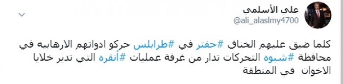 وكتب الأسلمي عبر تغريدة له على "تويتر" رصدها " المشهد العربي": "كلما ضيق عليهم الخناق حفتر في طرابلس حركوا أدواتهم الإرهابية في محافظة شبوة".