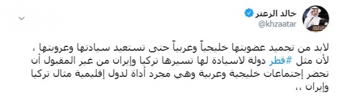 وكتب الزعتر عبر تغريدة له على "تويتر" رصدها " المشهد العربي":" لابد من تجميد عضويتها خليجياً وعربياً حتى تستعيد سيادتها وعروبتها ، لأن مثل قطر دولة لا سيادة لها تسيرها تركيا وإيران".