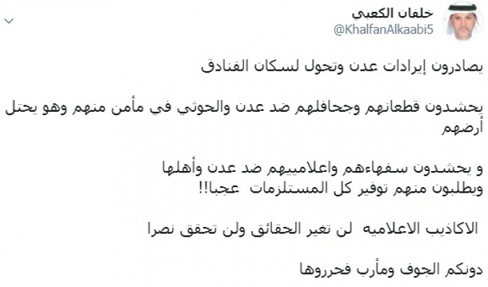 وكتب الكعبي عبر تغريدة له على "تويتر" رصدها " المشهد العربي": "يصادرون إيرادات عدن وتحول لسكان الفنادق، يحشدون قطعانهم وجحافلهم ضد عدن والحوثي في مأمن منهم وهو يحتل أرضهم، ويحشدون سفهاءهم وإعلامييهم ضد عدن وأهلها، ويطلبون منهم توفير كل المستلزمات عجبا".