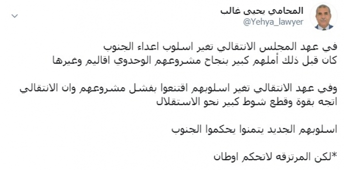 وكتب غالب عبر تغريدة له على "تويتر" رصدها " المشهد العربي": "في عهد المجلس الانتقالي تغير أسلوب أعداء الجنوب، كان قبل ذلك أملهم كبير بنجاح مشروعهم الوحدوي أقاليم وغيرها".