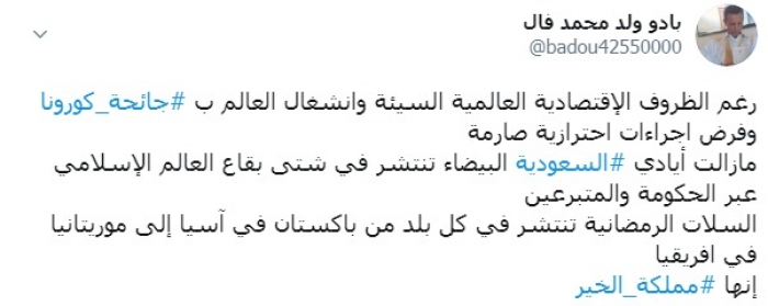 أكد الكاتب الصحفي الموريتاني بادو ولد محمد فال، اليوم الأحد، أن الأيادي البيضاء السعودية تمتد إلى كل بقاع العالم الإسلامي.