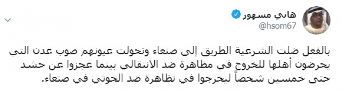 وكتب مسهور عبر تغريدة له على "تويتر" رصدها " المشهد العربي": "بالفعل ضلت الشرعية الطريق إلى صنعاء وتحولت عيونهم صوب عدن التي يحرضون أهلها للخروج في مظاهرة ضد الانتقالي بينما عجزوا عن حشد حتى خمسين شخصاً ليخرجوا في تظاهرة ضد الحوثي في صنعاء".