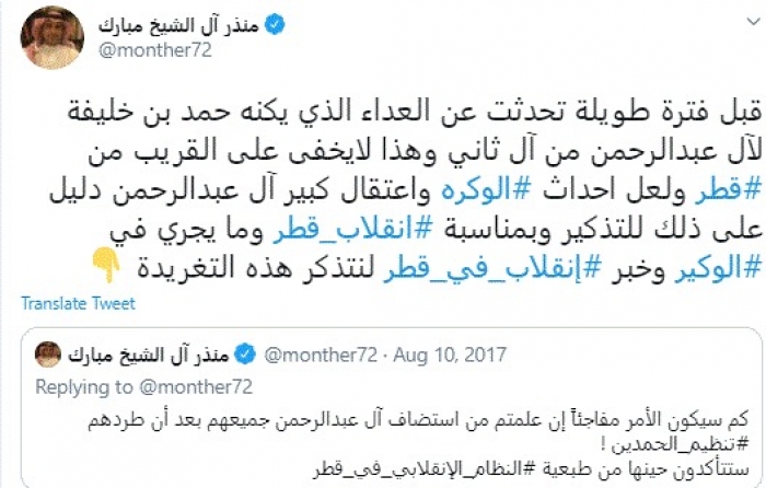 وأضاف: "للتذكير وبمناسبة انقلاب قطر وما يجري في الوكير وخبر انقلاب في قطر لنتذكر هذه التغريدة".