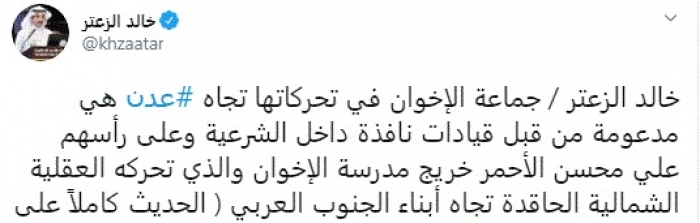 وقال في تغريدة عبر "تويتر" رصدها "المشهد العربي": "جماعة الإخوان في تحركاتها تجاه عدن هي مدعومة من قبل قيادات نافذة داخل الشرعية وعلى رأسهم علي محسن الأحمر خريج مدرسة الإخوان والذي تحركه العقلية الشمالية الحاقدة تجاه أبناء الجنوب العربي".