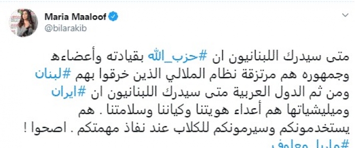 وكتبت في تغريدة عبر "تويتر" رصدها "المشهد العربي": "متى سيدرك اللبنانيون ان حزب الله بقيادته وأعضاءه وجمهوره هم مرتزقة نظام الملالي الذين خرقوا بهم #بنان ومن ثم الدول العربية".
