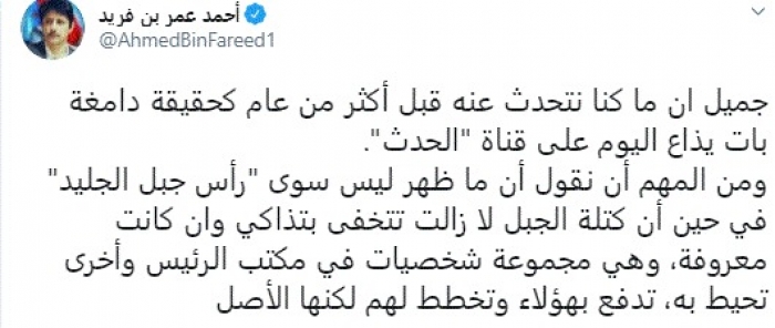 وقال في تغريدة عبر "تويتر" رصدها "المشهد العربي": "جميل أن ما كنا نتحدث عنه قبل أكثر من عام كحقيقة دامغة بات يذاع اليوم على قناة الحدث".