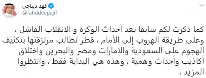 وكتب في تغريدة عبر "تويتر" رصدها "المشهد العربي": "كما ذكرت لكم سابقا بعد أحداث الوكرة والانقلاب الفاشل، وعلى طريقة الهروب إلى الأمام، قطر تطالب مرتزقتها بتكثيف الهجوم على السعودية والإمارات ومصر والبحرين واختلاق أكاذيب وأحداث وهمية، وهذه هي البداية فقط، وانتظروا المزيد".