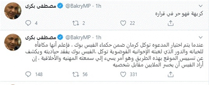 انتقد الإعلامي والبرلماني المصري مصطفى بكري، اختيار توكل كرمان ضمن مجلس الإشراف على محتوى فيس بوك وذلك رغم تأييدها الكيانات والجماعات الإرهابية وعلى رأسها جماعة الإخوان.