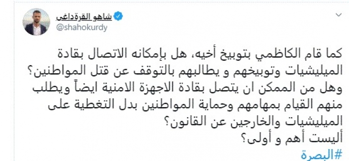 وقال في تغريدة عبر "تويتر" رصدها "المشهد العربي": "كما قام الكاظمي بتوبيخ أخيه، هل بإمكانه الاتصال بقادة الميليشيات وتوبيخهم و يطالبهم بالتوقف عن قتل المواطنين؟".