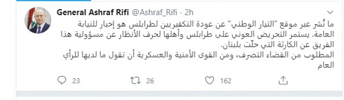 وقال في تغريدة عبر "تويتر" رصدها "المشهد العربي": "ما نُشر عبر موقع التيار الوطني عن عودة التكفيريين لطرابلس هو إخبار للنيابة العامة يستمر التحريض العوني على طرابلس وأهلها لحرف الأنظار عن مسؤولية هذا الفريق عن الكارثة التي حلّت بلبنان".