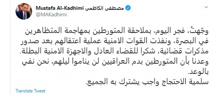 وقال في تغريدة عبر "تويتر" رصدها "المشهد العربي": "وجّهتُ، فجر اليوم، بملاحقة المتورطين بمهاجمة المتظاهرين في البصرة، ونفذت القوات الأمنية عملية اعتقالهم بعد صدور مذكرات قضائية، شكرا للقضاء العادل والأجهزة الأمنية البطلة".