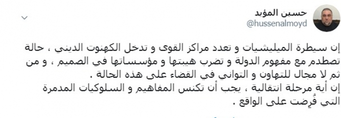وكتب المؤيد عبر تغريدة له على "تويتر" رصدها " المشهد العربي": "إن سيطرة المليشيات و تعدد مراكز القوى و تدخل الكهنوت الديني، حالة تصطدم مع مفهوم الدولة و تضرب هيبتها و مؤسساتها في الصميم ، ومن ثم لا مجال للتهاون و التواني في القضاء على هذه الحالة".