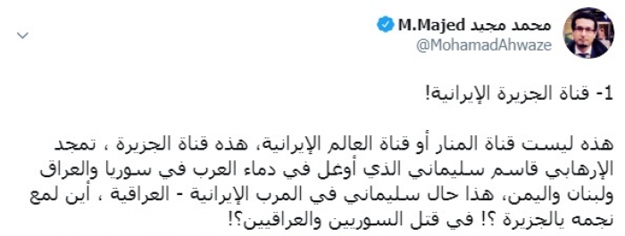 وكتب الأحوازي عبر تغريدات له على "تويتر" رصدها " المشهد العربي":" قناة الجزيرة الإيرانية، هذه ليست قناة المنار أو قناة العالم الإيرانية، هذه قناة الجزيرة ، تمجد الإرهابي قاسم سليماني الذي أوغل في دماء العرب في سوريا والعراق ولبنان واليمن، هذا حال سليماني في المرب الإيرانية - العراقية ، أين لمع نجمه يا جزيرة ؟! في قتل السوريين والعراقيين؟!".