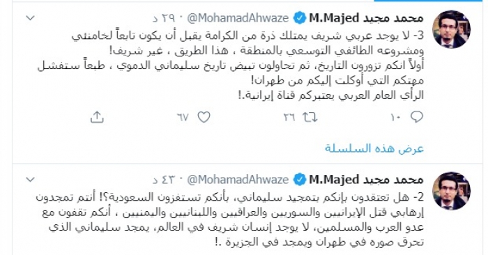 وتابع :"لا يوجد عربي شريف يمتلك ذرة من الكرامة يقبل أن يكون تابعاً لخامنئي ومشروعه الطائفي التوسعي بالمنطقة ، هذا الطريق ، غير شريف! أولاً أنكم تزورون التاريخ، ثم تحاولون تبيض تاريخ سليماني الدموي ، طبعاً ستفشل مهمتكم التي أوكلت إليكم من طهران! الرأي العام العربي يعتبركم قناة إيرانية".