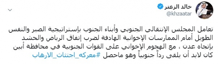 وكتب الزعتر عبر تغريدة له على "تويتر" رصدها " المشهد العربي": "تعامل المجلس الانتقالي الجنوبي وأبناء الجنوب باستراتيجية الصبر والنفس الطويل أمام الممارسات الإخوانية الهادفة لضرب اتفاق الرياض والحشد باتجاه عدن".