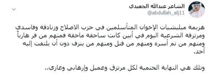 وكتب الجعيدي عبر تغريدة له على "تويتر" رصدها " المشهد العربي": "هزيمة ميليشيات الإخوان المتأسلمين في حزب الاصلاح وزنادقة وفاسدي ومرتزقة الشرعية اليوم في أبين كانت ساحقة ماحقة فمنهم من فر هارباً ومنهم من تم أسره ومنهم من قتل ومنهم من ينزف دون أن يلتفت إليه أحد".