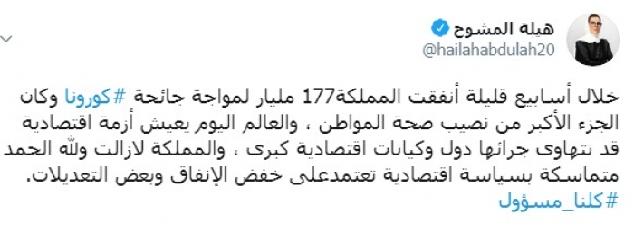 وكتبت المشوح عبر تغريدة لها على "تويتر" رصدها " المشهد العربي": "خلال أسابيع قليلة أنفقت المملكة177 مليار لمواجهة جائحة كورونا وكان الجزء الأكبر من نصيب صحة المواطن".