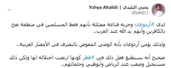 وكتب التليدي عبر تغريدة له على "تويتر" رصدها " المشهد العربي": "لدى أردوغان وحزبه قناعة مضللة بأنهم فقط المسلمين في منطقة تعج بالكافرين وأنهم يد الله عند العرب".