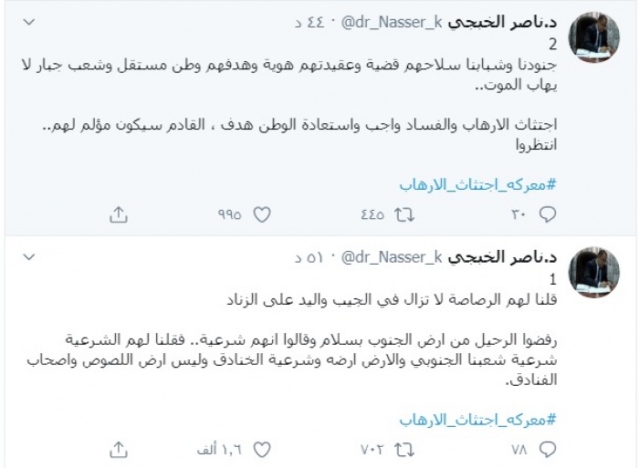 وكتب الخبجي عبر تغريدة له على "تويتر" رصدها " المشهد العربي": "قلنا لهم الرصاصة لا تزال في الجيب واليد على الزناد، رفضوا الرحيل من أرض الجنوب بسلام وقالوا أنهم شرعية، فقلنا لهم الشرعية شرعية شعبنا الجنوبي والأرض أرضه وشرعية الخنادق وليس أرض اللصوص وأصحاب الفنادق".