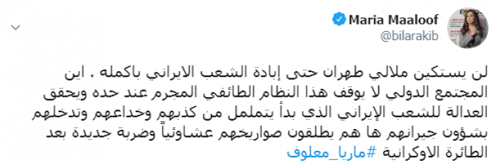 وكتبت معلوف عبر تغريدة لها على "تويتر" رصدها " المشهد العربي":" لن يستكين ملالي طهران حتى إبادة الشعب الايراني بأكمله".